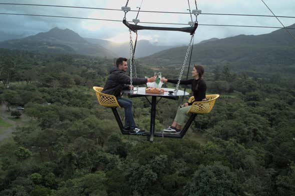 After a short drive we'll arrive at a leafy natural area where the Skytable is located. This structure with a capacity for 2 people, which is suspended 60 (197 feet) metres above the ground, has a table and two chairs. Once there, the instructor will adjust the harnesses to take you up into the sky.